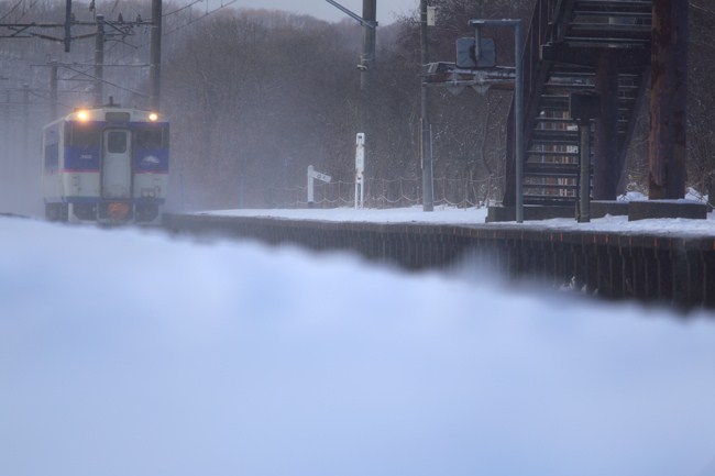 雪が激しくなったとことで、上り苫小牧行きは連続してキハ40。未だ日高本線の復旧の目処が立たず、室蘭本線で頑張る日高色でした。