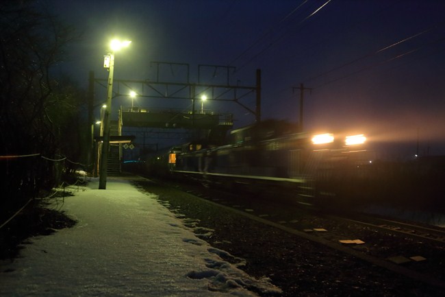 2月、気温が上昇して雨の週末になりました。土曜夕刻、微かに青が残る空色の下、上りカシオペアが通過しました。