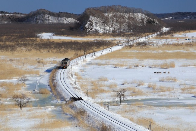 そして、線路が大きく弧を描く、湿原クライマックス。ここで標準レンズに交代。日が陰る心配無用の快晴の冬空の下、軽快に気動車を絶景の添え物にして、エゾシカの群れ、遠くにはワカサギ釣りのテントも見えます。