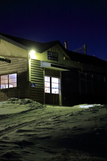 空にまだ色が残る時間に、釧路とは逆方向の上厚内駅に到着しました。私の好きな木造駅舎、山間部ですので雪深く、いい雰囲気です。