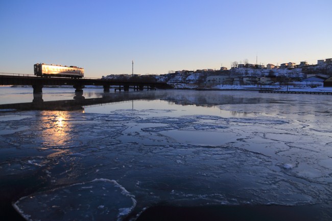 7時過ぎに、花咲線上り始発列車が釧路川を渡るとき、ちょうど朝日が登り、キハ54のステンレスボディを照らす。劇的なタイミングでした。