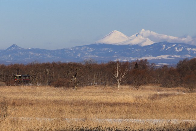 釧網本線を撮りながら北上します。雌阿寒岳が見通せる遠矢の神社あたりで、上り列車。このときの気温がマイナス16度。滞在中最低気温でした。