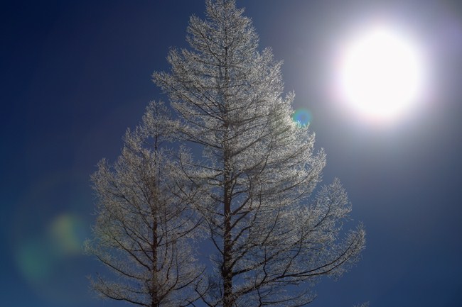 内陸部は冷え込んでおり、川や沼など、水の近くでは樹氷が見られました。線路に沿った木々も樹氷になっているかもと期待が膨らみました。