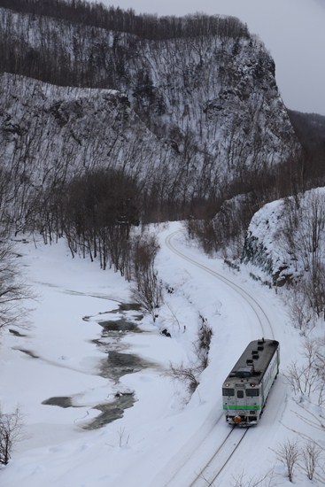 14時過ぎ、白滝発祥の地で普通列車を、食事も取らず、せっせと撮ります。湧別川も真白です。