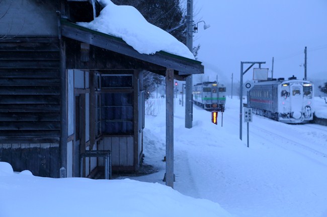 そろそろ日没の時刻。なごり雪降る夕暮れ時の下白滝駅。快速きたみと交換で下り普通列車が到着しました。当たり前のことですが、列車が停車してこそ駅。