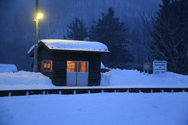 日が暮れて、この日最後の撮影予定の上白滝駅に向かう途中、明かりが灯った旧白滝駅。