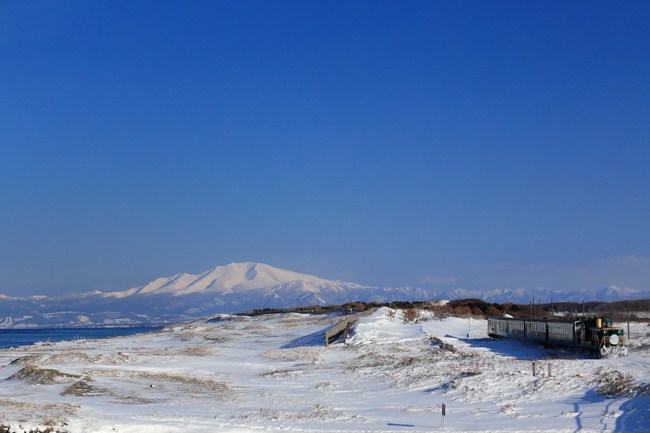 知床連山の付根にある海別岳バックに、白い丘陵を行く、流氷ノロッコ。1箇所で構えながら3カット頑張りました。いよいよ撮影のファイナルステージへ。