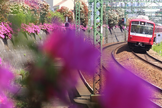 帰りは、線路の反対側を歩いて能見台に戻る途中、ツツジと800形。