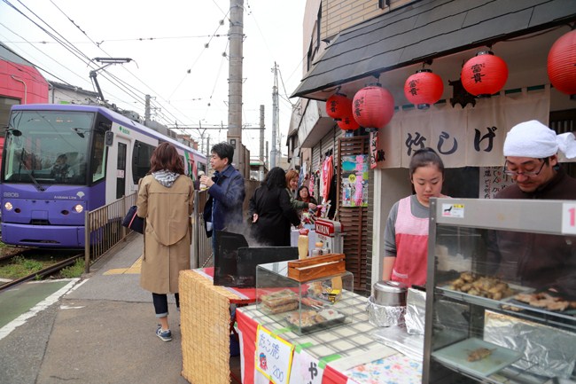 お花見で賑わう、荒川線飛鳥山駅。