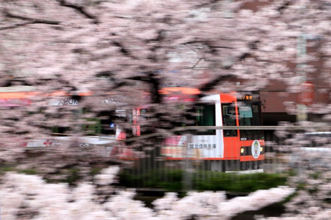 デビュー仕立ての8900形。こちらも城北信金の桜塗装。お決まりの流し撮りです。