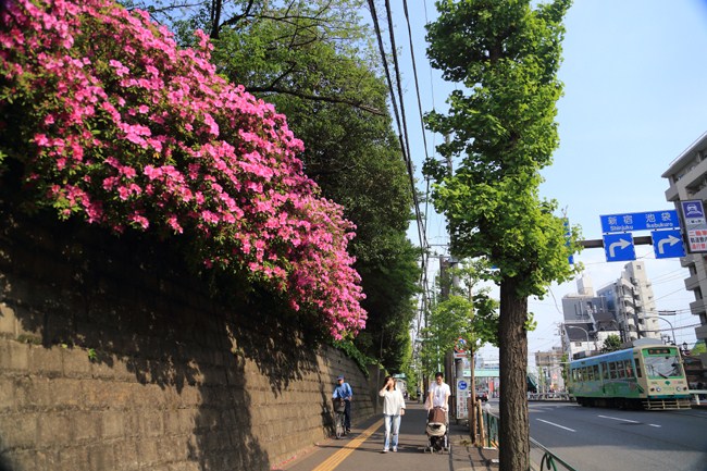 ツツジ満開の飛鳥山を行く、都電7000形。最近めっきり数が少なくなりました。