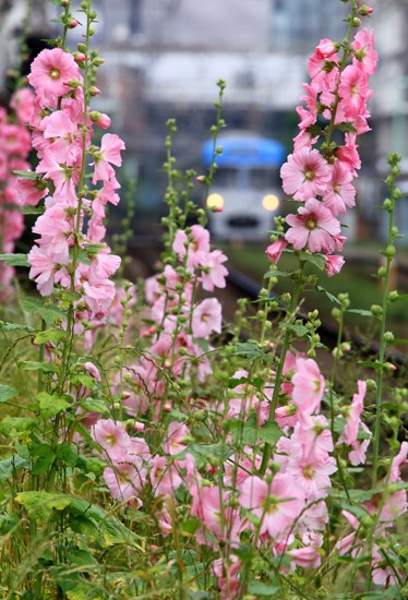 紫陽花とはセットで線路端を彩るタチアオイ