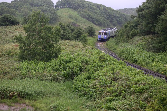 雨は止みませんが、次の下り、スラントノーズが編成に入った特急サロベツは、今回の旅のメインの被写体。宗谷丘陵らしい場所を選んで撮りましたが、稚内側は 『残念な顔』でした。後追い、サロベツHMの183スラントノーズです。