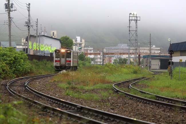 小雨の朝、霧も出ています。やむを得ず、始発列車は、稚内市街地の踏切で。
