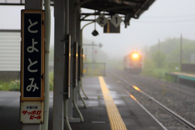 抜海の宗谷丘陵は、草木は雨に濡れ、霧で視界不良で断念し、上り一番列車は豊富駅で駅撮り。