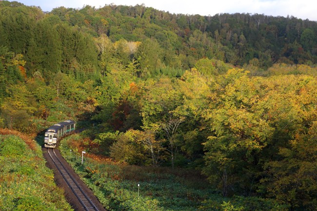 蘭越始発のニセコライナー(キハ2013両)を、昆布とニセコ間の線路をオーバークロスする道路。一瞬の朝日が車両と紅葉の木々に当たりました。