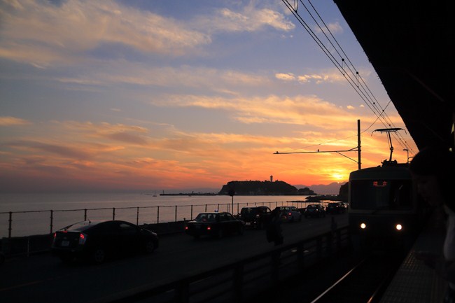 江ノ島と富士山の間に日が沈みました。当初の予定では花火はここで撮るつもりでしたが、急遽予定を変更し、この電車に乗って七里ヶ浜へ。