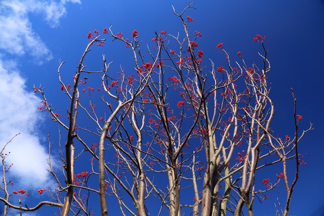 ナナカマドの赤い実と、広がってきた空の青と、いい感じ。