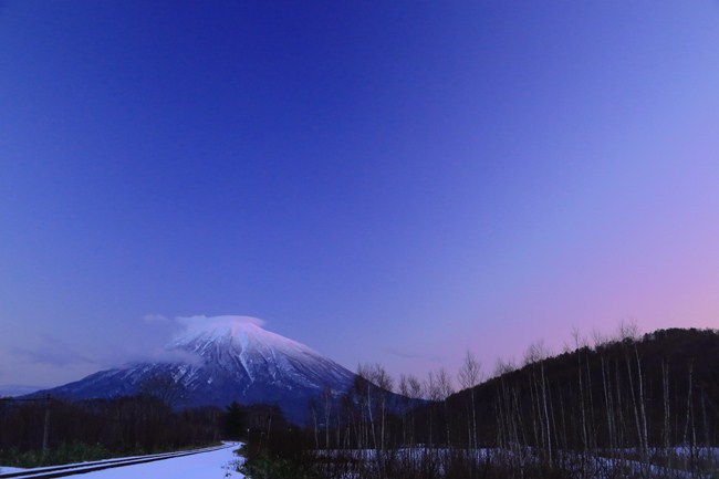 天気予報からはまったく期待できなかった羊蹄山。日が沈みホンノリ空が茜色の時刻に北四踏切。こんなにくっきり見えて、列車通過まであと10分です。