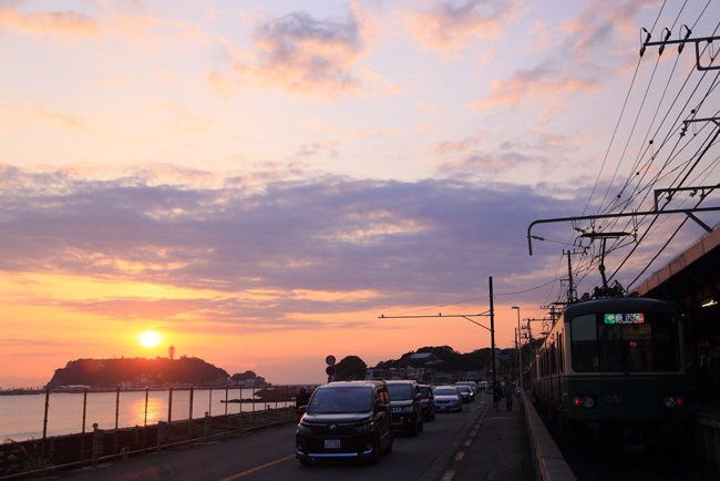 ラッキーなことに、ちょうど、江ノ島に日が沈む日でした。