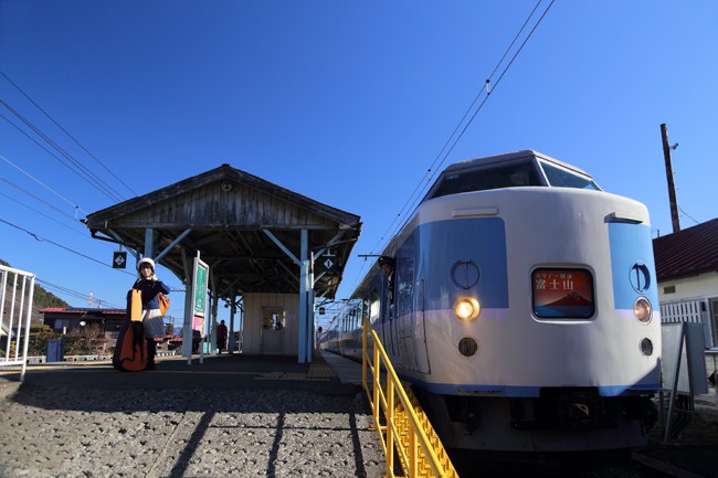 雲一つない冬晴れ。三つ峠で下車です。ここから歩いて15分、いつもの踏切へ向かいます。