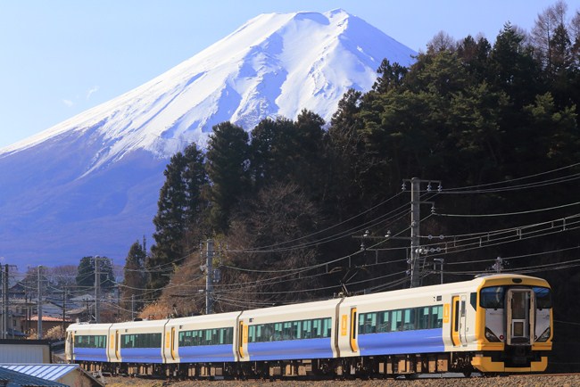 到着が遅かったので、富士はやや逆光気味。まずは、千葉からやってきた快速列車。ここでは5両編成は長大です。