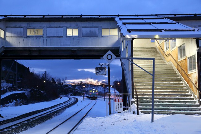 始発列車を見送って。極寒ですが、雪は少なめです。