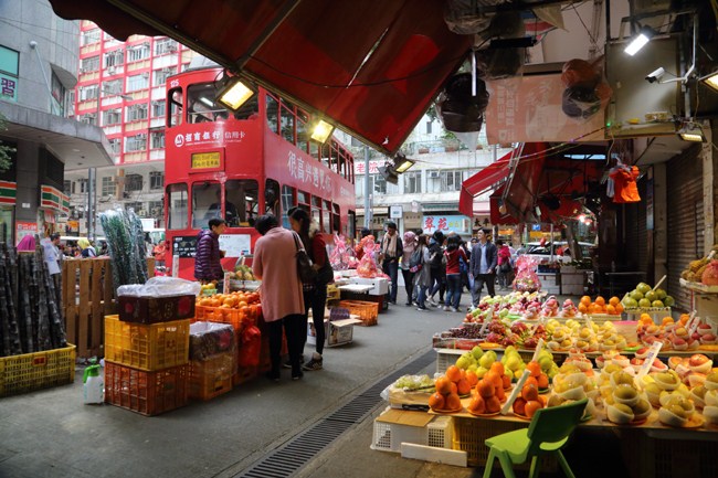 線路はさらに90度カーブして、メインストリートと並行します。ここから約200mほどの直線が北角の市場通り。香港トラムが軒先を縫うように走る、一番訪ねたかった場所です。