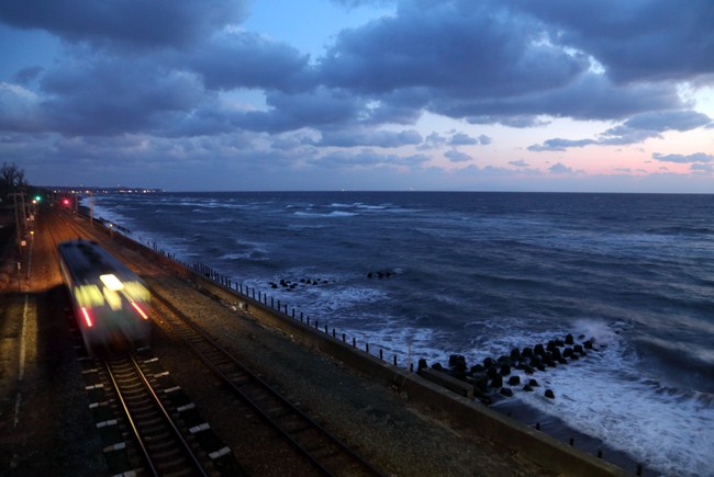 雲多めですが、なかなかいい感じの黄昏空。遠くに室蘭の町の灯り、荒れ気味の噴火湾。去りゆくテールランプは哀愁がありますね。