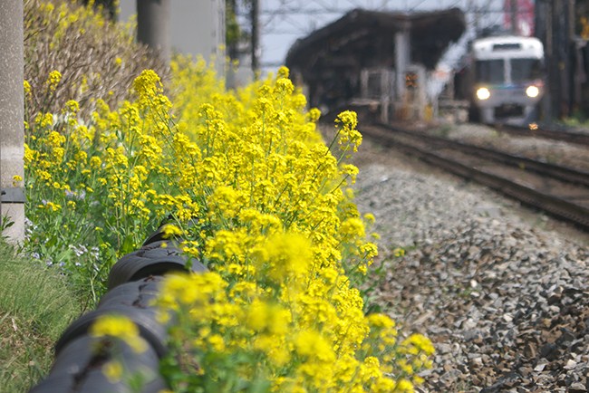菜の花咲く、新代田と下北沢間。気温が上がり、陽炎立つ午後です。