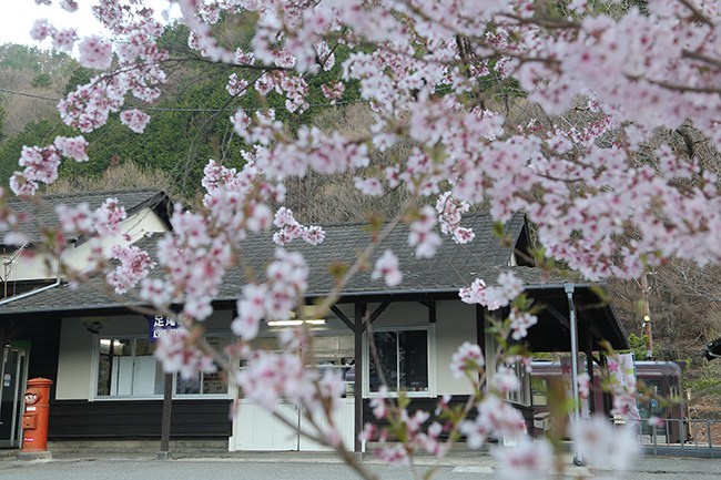 足尾駅も桜満開。快晴なので、日が昇った後の光線や青空が楽しみです。