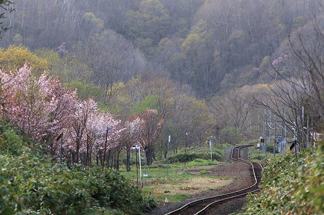 そして、17時近くに比羅夫に到着。踏切から望遠で。桜が咲いていました。