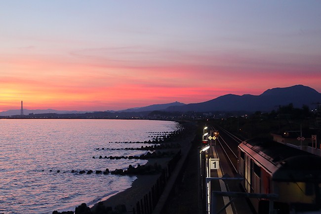 夕焼けがいい感じになってきた頃、下り貨物が到着。貨物どうしの交換のため、しばらく停車します。