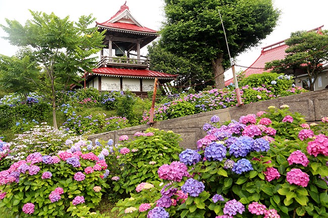 フェリーは瀬棚港に13:30に到着。そのままレンタカーで日本海に沿って、島牧、寿都を通り、岩内まで北上しました。昨年の夏休みと同じルートでしたが、今回は快晴で青い日本海を眺めながら快適なドライブでした。せっかく北海道に来たのに2日間まったく鉄無し生活。目指せ函館本線と倶知安方面に気持ち先行の運転のさなか、あまりに見事な紫陽花が目に入ってきました。これは一見しないと立ち寄りました。後で調べてわかったことですが、北の紫陽花寺として有名な明善寺でした。私がこれまでの人生で見た最も鮮やかな紫陽花でした。