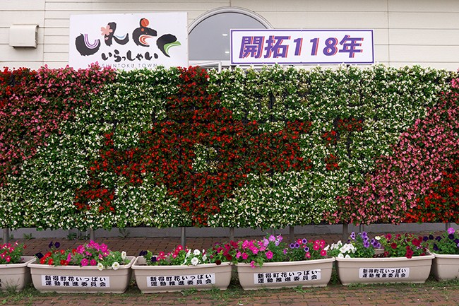 増田山に向かう前に立ち寄った新得駅。駅前には、花でデザインした北海道の地図! 北方領土もちゃんと入っています。真ん中の白は、蕎麦の名所である当地「新得」を表しているのでしょうね。