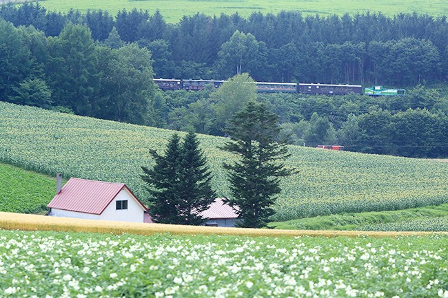 観光シーズンピークの富良野・美瑛、国道237号線では、渋滞もありました。手前にジャガイモの花、美馬牛の赤い家と、美瑛を象徴するような場所でノロッコ号を撮影。美瑛駅では、本日4つ目の「ふるさとご当地入場券」をゲットしました。