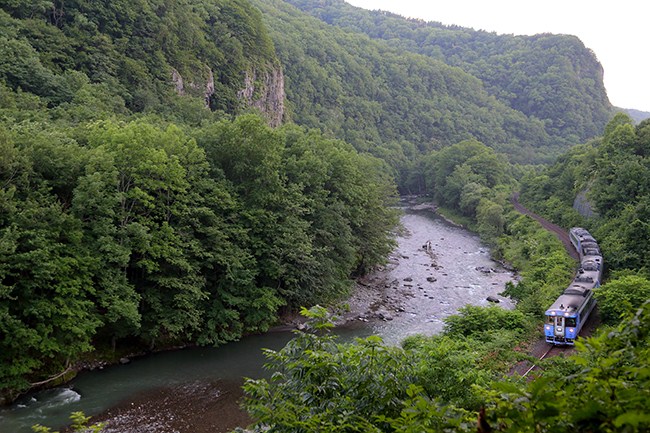夏場の高速は速いです。愛別から、あっという間に白滝。白滝有名ポイントでの「大雪(特急)」撮影に余裕で間に合いました。逆光条件で焼けてきた空を強調するも良しでしたが、湧別川の流れを強調する構図で普通に撮りました。
