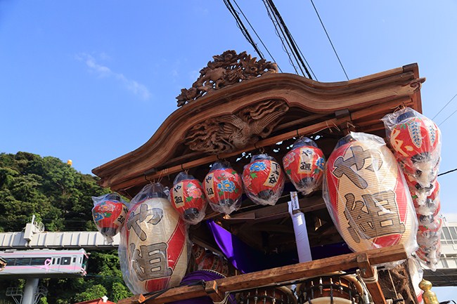 夕方近くになると、湘南モノレール江ノ島駅前あたりに、各町内の山車が集結します。一応、モノレールを入れて1枚。
