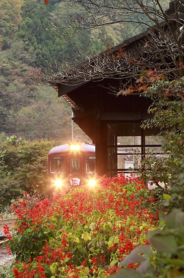 足尾から上り列車をサルビア越しに。やはりこの旧型が落ち着きますね。