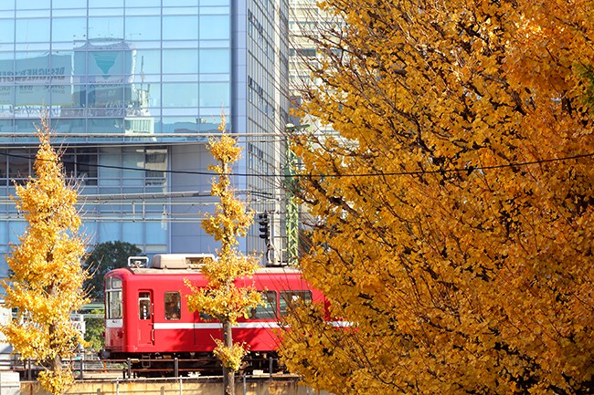師走の紅葉。銀杏が見頃。赤い電車と組み合わせが似合います。