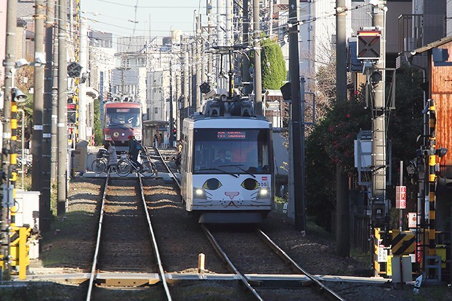 玉電らしさが残る線路と街並みと、玉電110周年ラッピング車の離合する光景。両車両とも期間限定なので、貴重なシーンです。