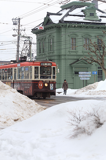 末広町では、定番相馬本社ビルの洋風木造建物と市電を撮ります。前日は雨だったとは言え、雪は多めの函館です。ちょうど私好みの車両が通過してくれました。朝練終了です。