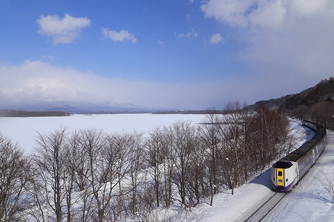 朝食を食べて、ゆっくりチェックアウトし、今日は撮影地大沼に向かいます。臨時北斗通過は13時30分。1時間以上前に到着しましたが、もう先客がいらっしゃいました。凍った小沼と青空、残念ながら駒ヶ岳は見えません。まずは上りスーパー北斗。