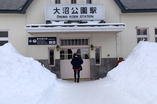 大沼公園駅。駅前の雪が多いのにはびっくり。ここでご当地入場券をゲットしました。