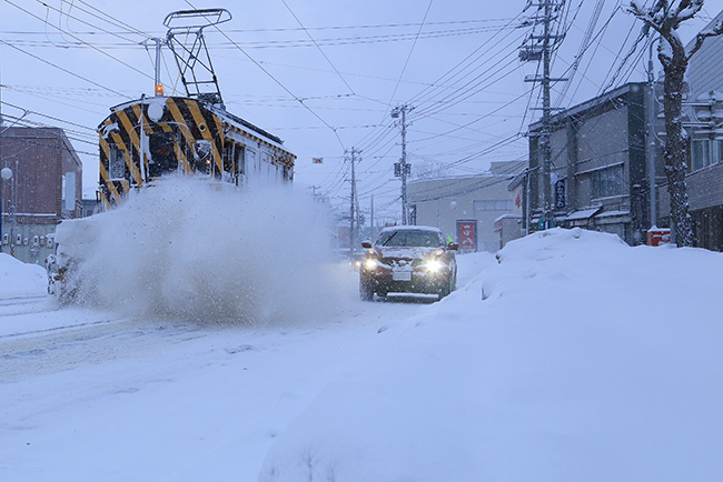 突然やってきた530を撮り終え呆然としていると、その次、さらに凄いものが、湯の川温泉電停に見えました。再び、標準レンズのままです。函館では、冬シーズン中、日中これが走るのは極めて珍しいことと思います。辛うじてですが、ササラが豪快に雪を巻き上げて走るシーンを撮れてよかったな。