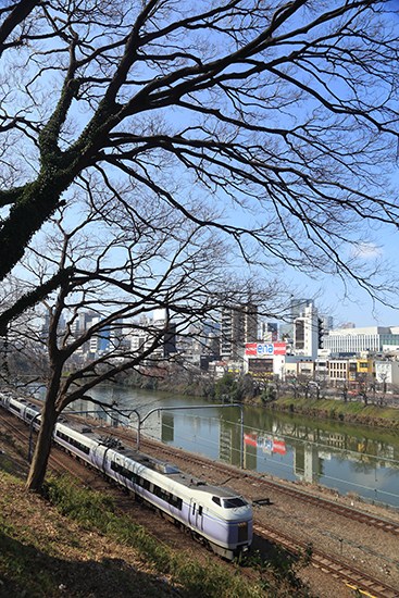 都心のスーパーあずさ。3月初めは、まだ枯れ木の風景です。ここで快晴の条件で桜を撮りたかったな。