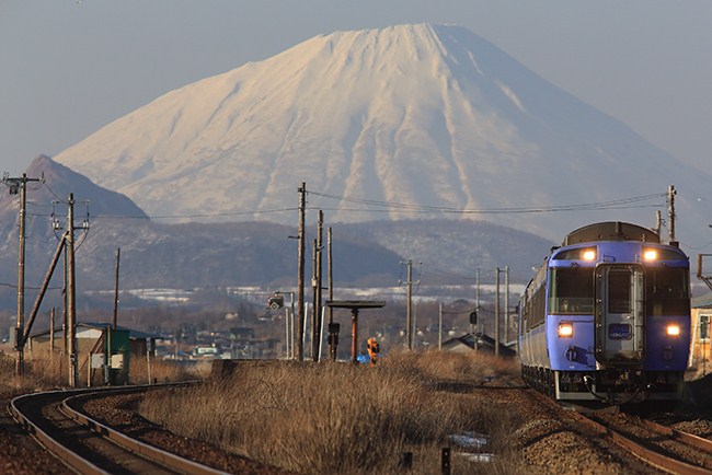 上空から見えていた羊蹄山。勿論、地上からもクリアに見えます。とくに目当ての車両は無くとも、この景観なら文句なし。ここで、183系北斗、DF200貨物、キハ281スーパー北斗を撮りました。
