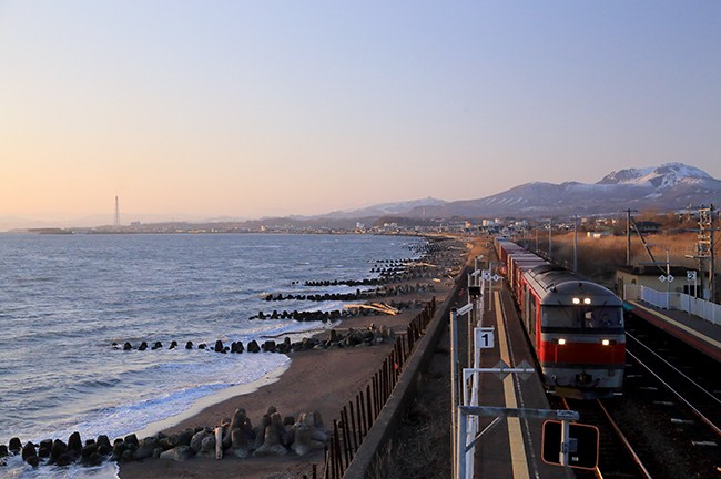 日没が遅くなりました。午後5時過ぎに北舟岡駅。これから1時間、貨物、普通列車、特急列車など通貨車両ラッシュの時間帯です。ホームに立つとまだ風が冷たいですが、噴火湾は穏やかな春の海です。