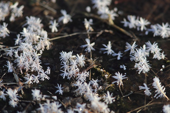 初日は絶好の天気でしたが、二日目はそれほどでもなく、比較的天気の良さそうな内陸方面に出かけました。まだ朝は冬の冷え込みで、水たまりに氷の結晶ができていました。