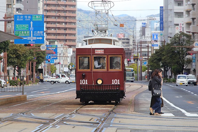 これは曜日と時間限定のレトロ電車。広電のホームページに公開されていたので、撮ることができました。冬場なこれに代わって、元ドイツ車のハノーバー電車が走っています。